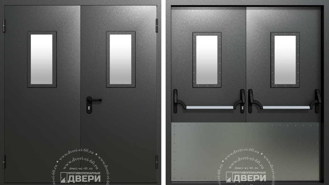 Двупольная остекленная противопожарная дверь с широким отбойником (антипаника) ПД-ДС023d ДМП(О)-2 EI-60