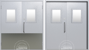 Двупольная остекленная техническая дверь серого цвета с ручкой-скобой и широким отбойником ТД-ДС014b
